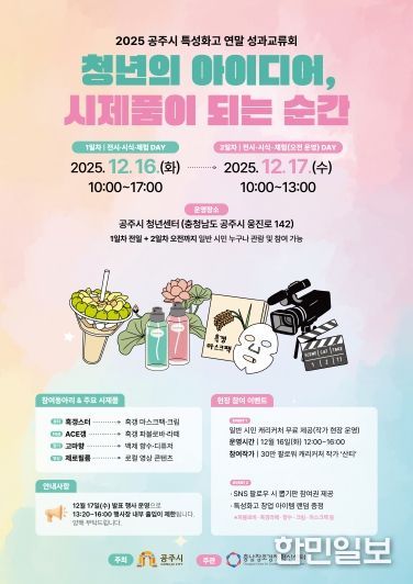 한민일보 서울포커스 임철현 기자 | (재)충남창조경제혁신센터는'2025년 예비청년 특화사업 성장지원(교육특구 시범사업)'의 일환으로 추진 중인 특성화고 창업동아리 프로그램의 성과를 시민들과 공유하기 위해 ‘2025 특성화고 연말 성과교류회’를 12월 16일부터 17일까지 지역 청년센터에서 개최한다고 밝혔다.