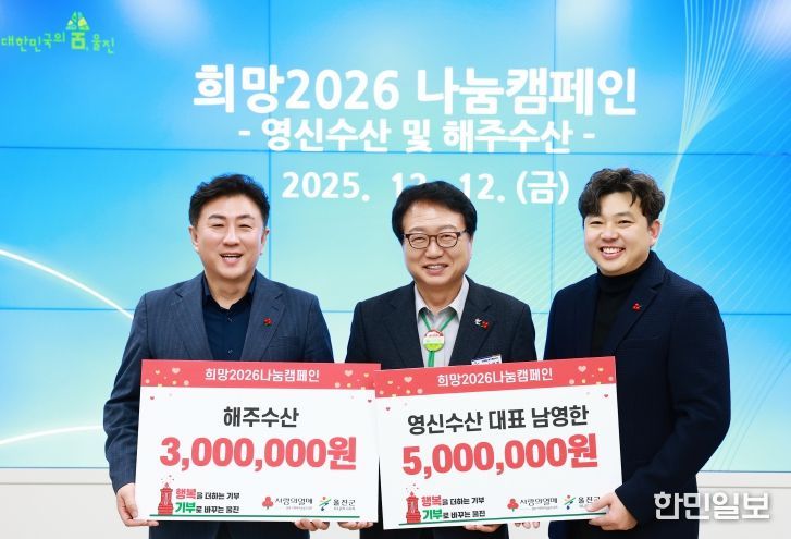 한민일보 서울포커스 김서윤 기자 | 울진군은 지난 12월 12일‘희망2026 나눔캠페인’을 통해 영신수산 남영한 대표로부터 성금 500만원과 해주수산 권일재 대표로부터 성금 300만원을 각각 기탁받았다.