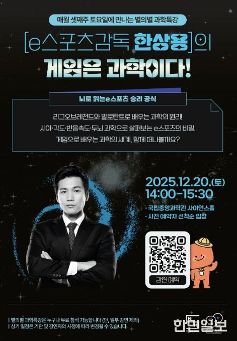 한민일보 서울포커스 기자 | 과학기술정보통신부 국립중앙과학관은 12월 20일 오후 2시, 매월 셋째 주 토요일에 열리는 ‘별의별 과학특강’의 12월 강연자로 오산대학교 e스포츠학과 한상용 교수를 초청해 '게임은 과학이다'라는 주제의 강연을 개최한다고 밝혔다.