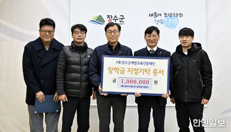 한민일보 서울포커스 김용택 기자 | 장수군은 케이워터기술(주)동화권사업소(소장 윤종희)가 지역 교육 발전과 인재 육성을 위해 (재)장수군애향교육진흥재단(이사장 최훈식)에 장학금 100만원을 기탁했다고 19일 밝혔다.