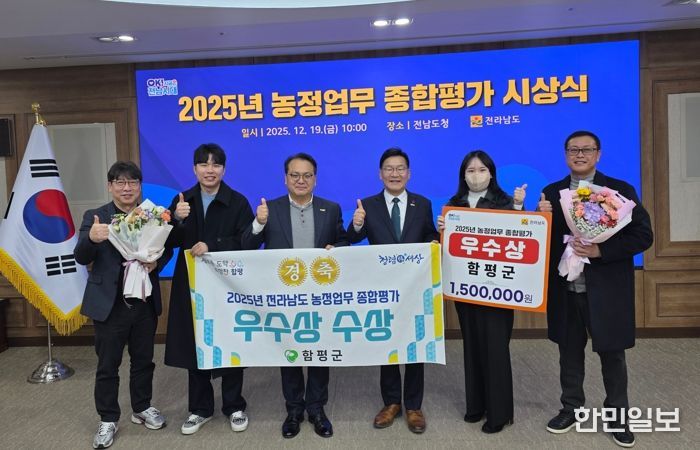 함평군은 지난 19일 전라남도청 서재필실에서 열린 2025년 전남 농정업무 종합평가에서 우수상을 수상했다고 22일 밝혔다.