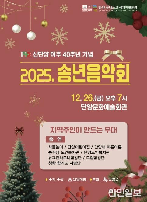 군 관계자는 “신단양 이주 40주년이라는 뜻깊은 해를 맞아 군민이 관객에 머무르지 않고 공연의 주체로 참여하는 송년음악회를 준비했다”며 “이번 무대가 지역 공동체의 결속을 다지고, 희망찬 새해를 함께 맞이하는 계기가 되길 바란다”고 말했다.