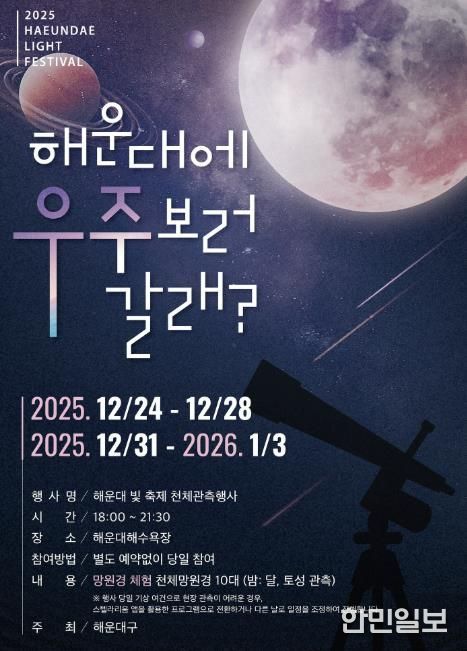 한민일보 서울포커스 임광현 기자 | 해운대구가 해운대빛축제 특별 이벤트 ‘우주 보러 갈래’를 12월 24~28일, 12월 31일~1월 3일에 운영한다.