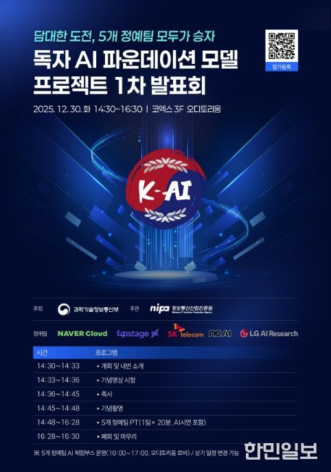 한민일보 서울포커스 기자 | 과학기술정보통신부와 정보통신산업진흥원(원장 박윤규)은 오는 12월 30일 14:30, 코엑스 오디토리움에서, 「독자 AI 파운데이션 모델」 프로젝트 1차 발표회를 개최한다.
