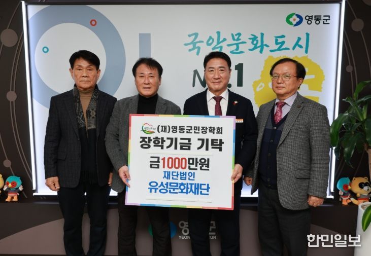 한민일보 서울포커스 김다남 기자 | 충북 영동군은 재단법인 유성문화재단이 22일 오후 영동군청을 방문해 지역 인재 육성을 위한 영동군민장학금 1,000만 원을 기탁했다고 밝혔다.