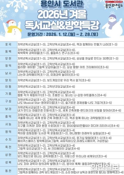한민일보 서울포커스 김성윤 기자 | 용인특례시는 내년 1월 12일부터 2월 28일까지 도서관에서 겨울 독서 교실과 방학 특강을 운영한다고 밝혔다.