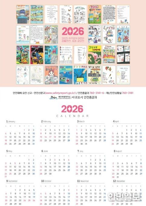 한민일보 서울포커스 김다남 기자 | 서귀포시는 지역사회에 생활 속 안전의식 확산을 위해 2025 어린이 생활안전사례 공모전 수상작 30작품을 활용한 안전문화달력 1,500부를 제작하여 전 부서와 학교, 유관기관에 배부했다고 밝혔다.