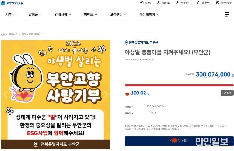 한민일보 서울포커스 김용택 기자 | 부안군은 고향사랑기부제 지정기부 ESG 사업으로 추진한 ‘야생벌 붕붕이를 지켜주세요!’ 프로젝트가 기부자들의 꾸준한 참여 속에 목표 모금액 3억원을 달성했다고 밝혔다.