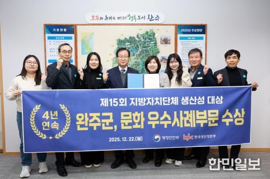 한민일보 서울포커스 박용남 기자 | 완주군이 ‘무장애 문화’를 행정 전반에 접목한 정책 성과를 인정받아, 행정안전부가 주최하고 한국생산성본부가 주관한 ‘제15회 지방자치단체 생산성대상’ 문화분야에서 기관표창을 수상했다.