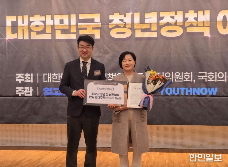 한민일보 서울포커스 박용남 기자 | 화순군은 23일 국회도서관 대강당에서 열린 ‘2025 대한민국 청년정책 어워즈’에서 청년 및 신혼부부 만원임대주택 정책으로 ‘혁신상’을 수상했다고 밝혔다.