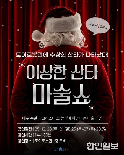 크리스마스 당일에는 ‘이상한 산타 마술쇼’가 펼쳐진다. 겨울 분위기에 어울리는 유쾌한 연출과 관객 참여형 구성으로 아이부터 어른까지 함께 즐길 수 있는 공연으로, 28일 주말까지 이어서 진행된다. 이와 함께 ▲산타와 함께 사진을 남길 수 있는 ‘이상한 산타와 한 컷’ ▲이상한 산타의 ‘선물 보따리’ 이벤트가 운영되며, 선물은 선착순 500명에게 제공되어 크리스마스 방문의 즐거움을 더할 예정이다.
