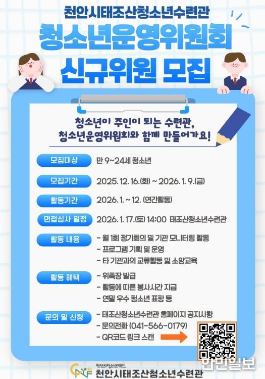 한민일보 서울포커스 황준형 기자 | (재)천안시청소년재단 천안시태조산청소년수련관은 내년 1월 9일까지 2026년 청소년운영위원회 신규 위원을 모집한다고 24일 밝혔다.