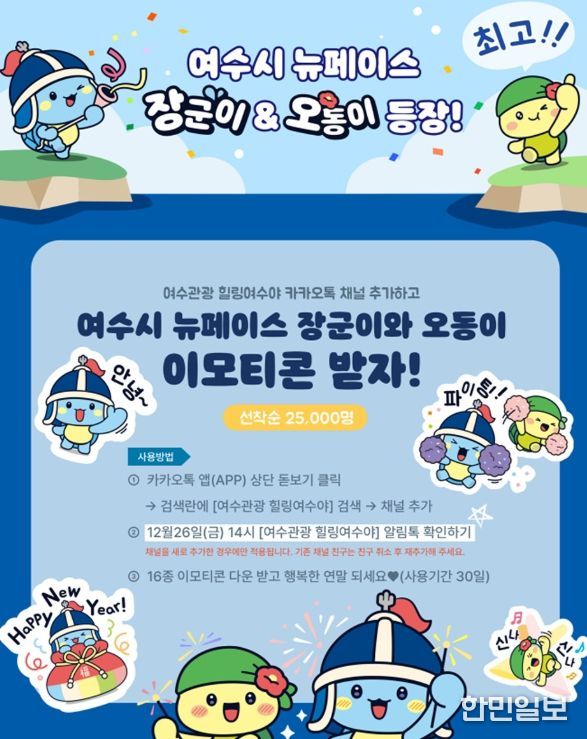한민일보 서울포커스 임광현 기자 | 여수시가 새롭게 리뉴얼된 마스코트 ‘장군이·오동이’ 카카오톡 이모티콘을 오는 26일 오후 2시부터 선착순 2만 5천 명에게 무료로 배포한다고 밝혔다.
