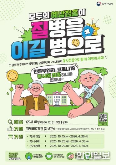 이번 절기 인플루엔자 예방접종은 65세 이상 어르신, 임산부, 어린이를 대상으로 실시되며, 코로나19 예방접종은 65세 이상 어르신, 면역저하자 및 감염취약시설 입소자를 대상으로 실시하고 있다.