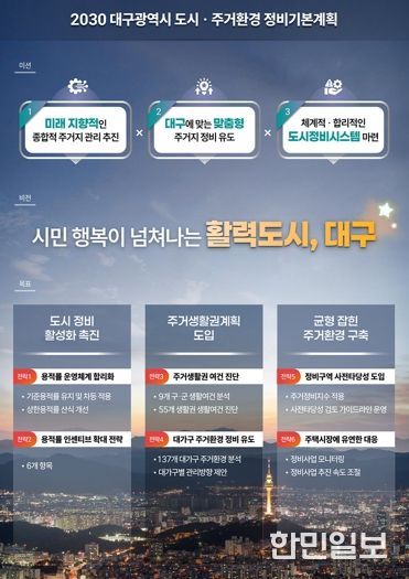 이번 변경안은 ‘시민 행복이 넘쳐나는 활력도시 대구’를 비전으로 ▲도시정비 활성화 촉진 ▲주거생활권계획 도입 ▲균형잡힌 주거환경 구축 등 3대 목표를 설정했다.