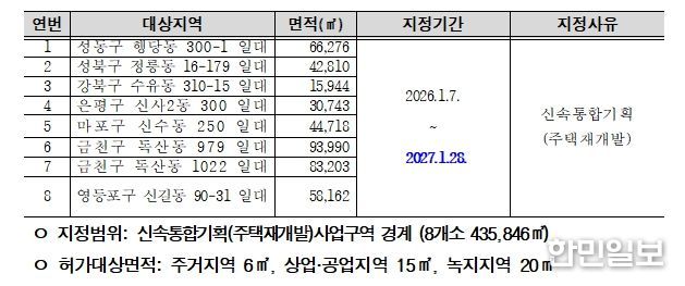 신규 지정 대상은 성동구 1곳, 성북구 1곳, 강북구 1곳, 은평구 1곳, 마포구 1곳, 금천구 2곳, 영등포구 1곳으로 총 8개 구역이다. 성동구 행당동 300-1 일대 외 7곳(총435,846㎡)이며, 효율적인 구역 관리를 위해 기존 신속통합기획 주택재개발 선정 구역과 동일한 만료 기간으로 설정했다.