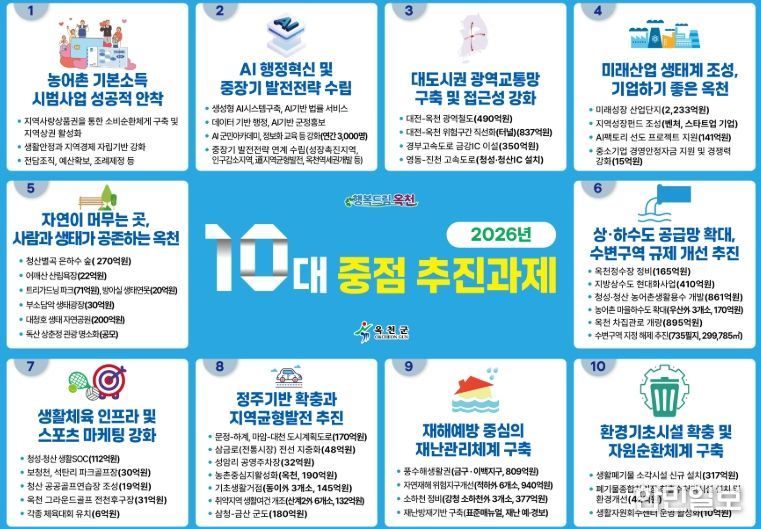 한민일보 서울포커스 김다남 기자 | 옥천군이 26일 2026년 군정 운영의 핵심 방향을 담은 10대 중점 추진과제를 발표하고, 군민 삶의 질 향상과 지속가능한 지역성장을 위한 정책 추진에 나선다.