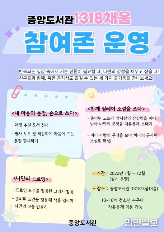한민일보 서울포커스 황준형 기자 | 천안시 중앙도서관은 내년부터 ‘1318채움 청소년 놀이터’를 운영한다고 26일 밝혔다.