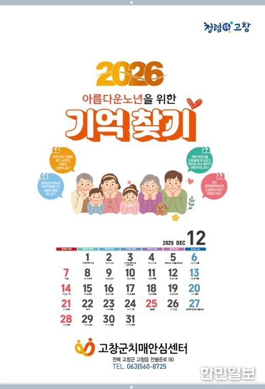 한민일보 서울포커스 박용남 기자 | 고창군 치매안심센터가 치매에 대한 올바른 인식 개선과 예방 실천을 돕기 위해 ‘2026년 건강달력’을 제작해 지역 주민에게 배부한다고 밝혔다.
