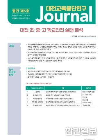 한민일보 서울포커스 유한희 기자 | 대전교육과학연구원 대전교육정책연구소는 2025년 대전교육종단연구저널 제5호'대전 초·중·고 학교안전 실태 분석', 제6호 '대전 교육가족의 정신건강 현황 분석'을 발간하여 대전 모든 기관 및 전국 교육정책연구소에 안내하고, 대전교육과학연구원 누리집에 공개했다고 밝혔다.