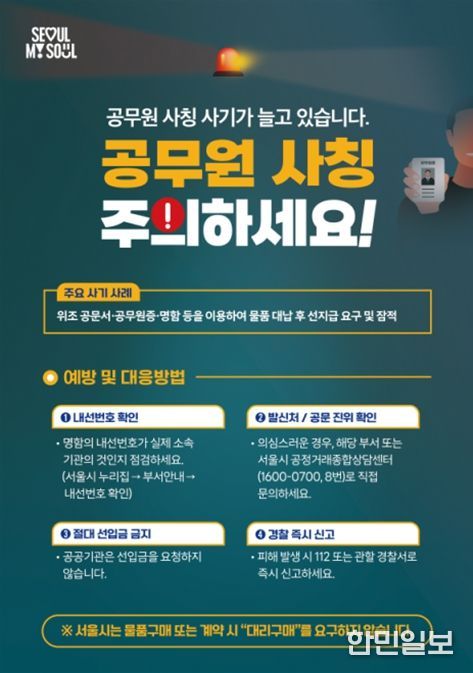한민일보 서울포커스 국용호 기자 | 서울시는 최근 중·소상공인을 대상으로 공무원 사칭 사기 피해가 끊이지 않고 발생하고 있어, 서울시공정거래종합상담센터 내 ‘공무원 사칭 사기 피해 신고센터’를 설치하고 적극 대응에 나선다.