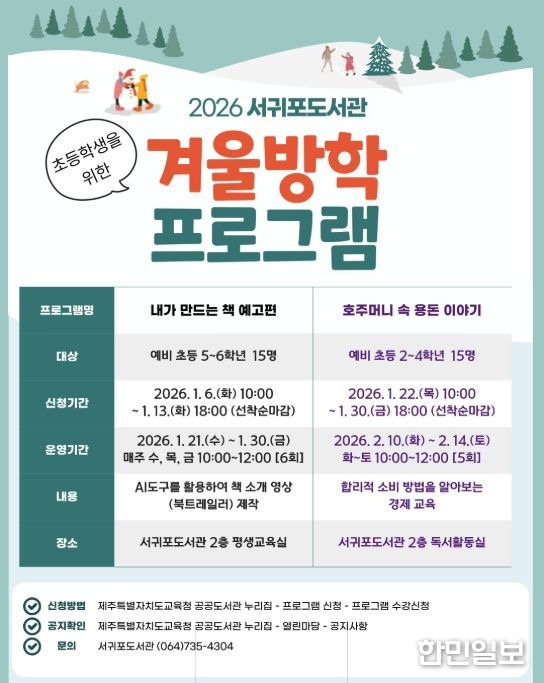 한민일보 서울포커스 임경복 기자 | 제주도교육청 서귀포도서관은 겨울방학을 맞아 어린이들의 호기심을 자극해 책 읽기의 즐거움과 경제 감각을 키우는 겨울방학 프로그램을 운영하며, 내년 1월 6일부터 참가자를 모집한다.