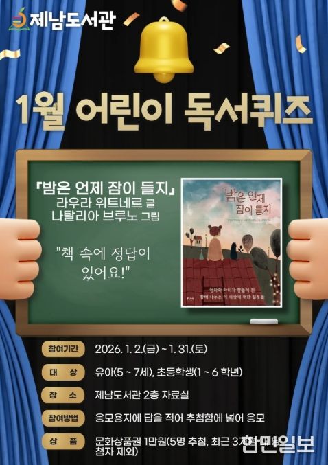 한민일보 서울포커스 임경복 기자 | 제주도교육청 제남도서관은 내년 1월 2일부터 6월 30일까지 자료실에서 어린이를 대상으로 책도 읽고, 문제도 풀어보는 ‘어린이 독서퀴즈’를 운영한다.