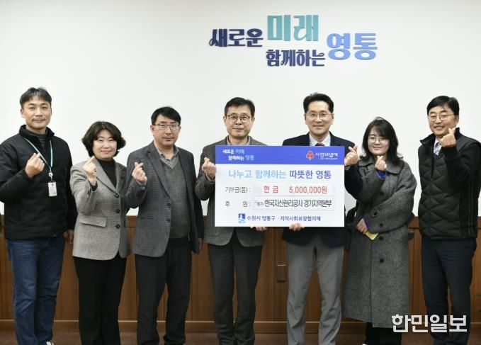한민일보 서울포커스 진광성 기자 | 수원시 영통구는 지난 24일 한국자산관리공사 경기지역본부에서 관내 경제적으로 어려움을 겪는 이웃을 위해 성금 500만 원을 기부했다고 밝혔다.