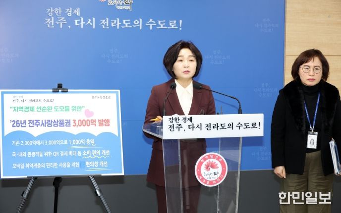 한민일보 서울포커스 김용택 기자 | 전주시가 2026년 병오년 새해부터 장기화된 경기 침체와 고물가 등으로 어려움을 겪는 소상공인과 지갑이 가벼워진 시민을 위해 전주사랑상품권을 50% 증액해 발행키로 했다.