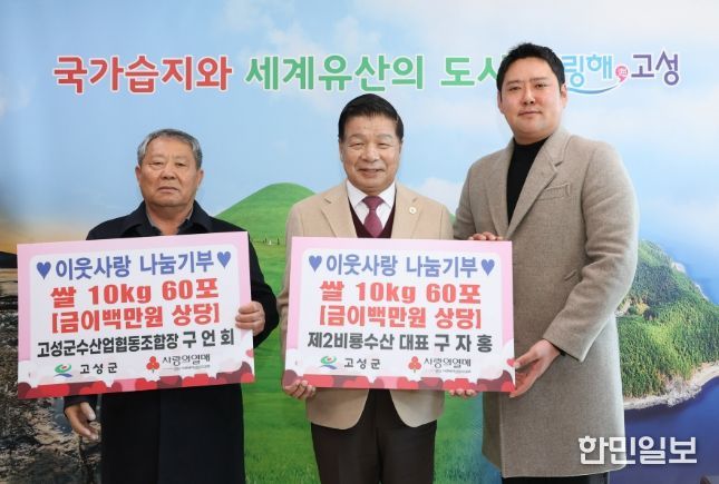 한민일보 서울포커스 김은금 기자 | 고성군 수산업협동조합 구언회 조합장과 제2비룡수산 대표 구자홍은 12월 26일 고성군을 방문하여 관내 경로당 지원을 위한 이웃사랑 나눔기부 쌀(10kg 120포) 400만 원 상당을 기탁하여 주위에 훈훈함을 선사했다.