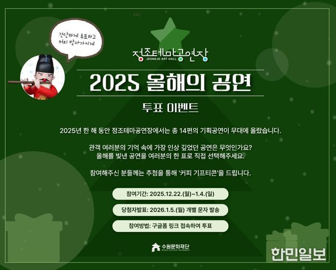 수원문화재단은 2026년 1월 4일까지 ‘2025 정조테마공연장 올해의 공연’ 관객 투표 이벤트를 진행한다.
