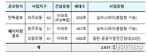 ②택지공모는 약 2천호 규모로 실시하며, 사업 대상지는 파주와동 A2 블록, 원주무실 S1 블록, 의왕초평 A1 블록 총 3곳이다. 파주와동 A2 블록과 원주무실 S1 블록은 실버스테이로, 의왕초평 A1 블록은 임대의무기간이 20년인 일반 공공지원민간임대로 공급한다.