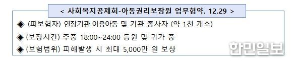 이번 야간 연장돌봄 사업에는 KB금융도 함께 참여한다. 복지부-KB금융 업무협약(’25.10.2.)을 통해 이번 사업 참여기관인 360개소를 포함한 전국 1천여 개 마을돌봄시설의 야간 시간대 이용아동과 종사자들의 안전을 함께 책임진다. 29일에는 사회복지공제회와 아동권리보장원이 업무협약을 맺어 연장기관 이용아동 및 기관 종사자를 대상으로 보험 가입 등을 지원할 예정이다.
