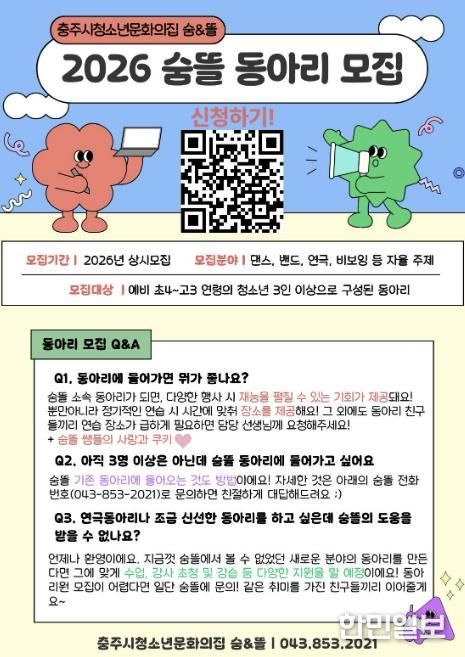 한민일보 서울포커스 김다남 기자 | 충주시청소년문화의집 숨&뜰은 2026년 한 해 동안 청소년들의 자율적인 문화 활동을 지원하기 위해 청소년 동아리를 상시 모집한다고 밝혔다.