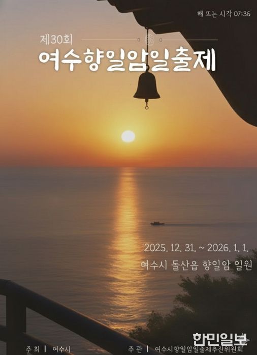 한민일보 서울포커스 임광현 기자 | 여수시는 오는 12월 31일부터 2026년 1월 1일까지 전국 4대 관음성지 중 하나이자 남해안 대표 해돋이 명소인 돌산 향일암 일원에서 ‘제30회 여수향일암일출제’를 개최한다고 밝혔다.