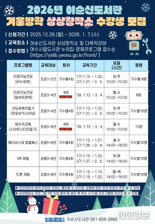 한민일보 서울포커스 임광현 기자 | 여수시는 12월 29일부터 2026년 1월 7일까지 ‘2026년 이순신도서관 겨울방학 상상창작소’ 수강생을 선착순 모집한다.