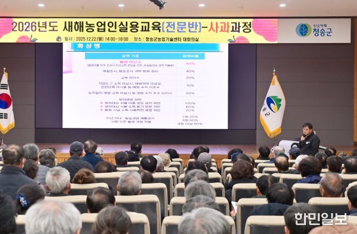 한민일보 서울포커스 김봉순 기자 | 청송군은 지난 22일부터 24일까지 3일간 청송군농업기술센터 대회의실에서 실시한 ‘2026년도 새해농업인 실용교육(전문반)’을 성황리에 마무리했다고 밝혔다.