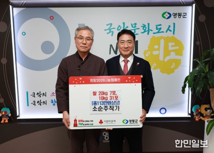 한민일보 서울포커스 김다남 기자 | 소순주 작가는 29일 영동군청을 방문해 지역사회에 따뜻한 온기를 전하고자 사랑의 성금으로 쌀 20kg 7포, 10kg 31포(113만 원 상당)를 기탁했다.