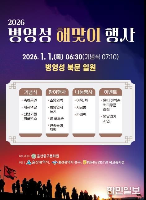 한민일보 서울포커스 기자 | 병오년(丙午年) 새해를 맞아 2026년 1월 1일 오전 6시 30분 울산 경상좌도병영성 북문 일원에서 주민 화합과 건강을 기원하는 ‘2026 병영성 해맞이 행사’가 열린다.