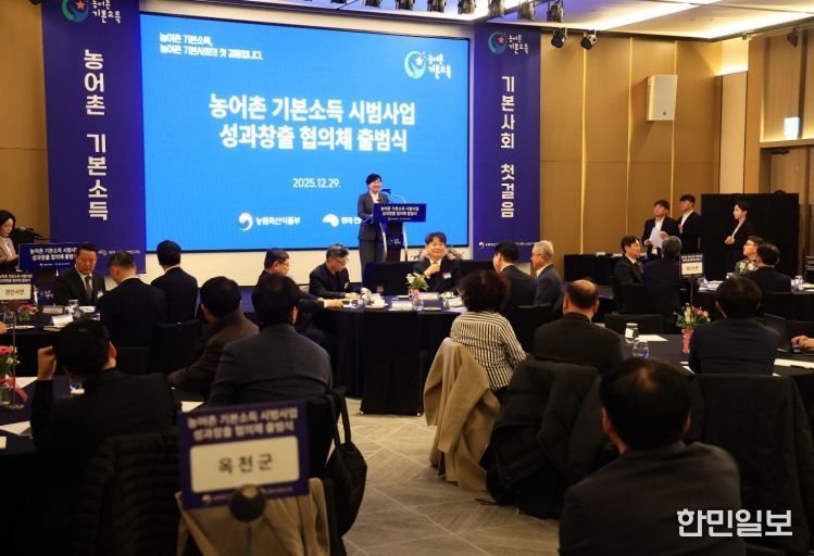 한민일보 서울포커스 임철현 기자 | 농림축산식품부와 경제·인문사회연구회은 12월 29일 오후 세종 코트야드 호텔에서 '농어촌 기본소득 시범사업 성과창출 협의체 출범식'을 개최했다. 이번 행사에는 송미령 농식품부 장관과 이한주 경인사연 이사장, NRC 농촌 기본사회 연구단, 시범사업 대상 10개 군 군수와 관할 광역 지방정부 및 관련 전문가 등 100여 명이 참석했다.