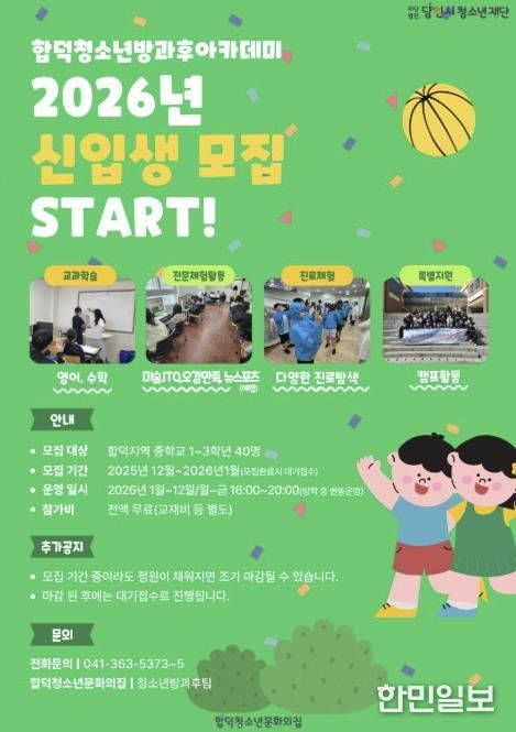 합덕청소년방과후아카데미 관계자는 “단순 돌봄을 넘어 청소년의 학습, 진로, 인성을 종합적으로 지원하는 질 높은 프로그램을 운영하겠다”며 “매년 조기 마감 사례가 있는 만큼 관심 있는 가정의 빠른 문의를 바란다”고 전했다.