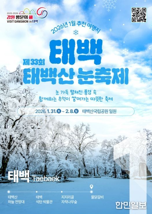 한민일보 서울포커스 임경복 기자 | 태백시는 강원특별자치도와 강원관광재단이 추진하는 ‘2026 강원 방문의 해’ 1월 추천 여행지로 홍천군과 함께 선정됐다고 밝혔다.