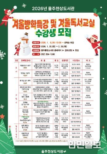 한민일보 서울포커스 기자 | 울주천상도서관이 다음달 20일부터 내년 2월 26일까지 겨울방학을 맞아 겨울방학특강 및 겨울독서교실을 운영한다고 30일 밝혔다.