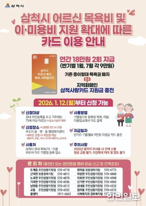 지원 방식은 기존 종이형 이용권을 폐지하고, 지역화폐인 ‘삼척사랑카드’에 지원금을 충전하는 방식으로 변경된다. 이를 통해 어르신의 이용 편의성을 높이고, 지역 내 소비 활성화 효과도 함께 도모한다.