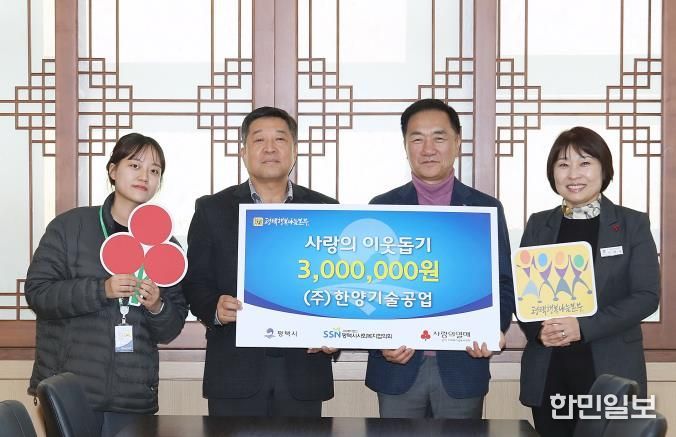 한민일보 서울포커스 황준형 기자 | 평택시 서탄면에 있는 ㈜한양기술공업은 관내 취약계층 지원을 위한 성금 300만 원을 평택시청 대외협력실에서 평택행복나눔본부에 전달했다.