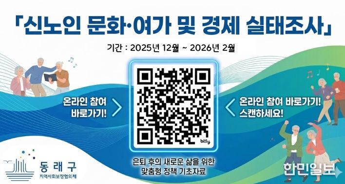 한민일보 서울포커스 임광현 기자 | 부산 동래구는 지역사회보장협의체(위원장 조정래) ‘신노인분과’가 급속한 고령화와 사회 구조 변화 속에서 새롭게 등장한 ‘신노인’ 세대의 삶과 욕구를 체계적으로 파악하기 위해 '신노인 문화·여가 및 경제 실태조사'를 12월부터 2026년 2월까지 약 3개월간 실시한다고 밝혔다.