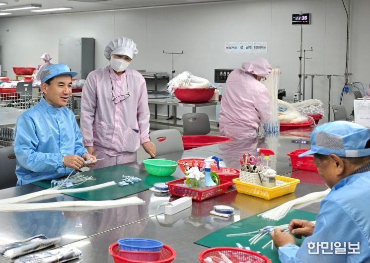 이후 김 지사는 생산공장을 둘러보고, 대표 생산품인 수액세트 조립과 포장 과정에 직접 참여했다.