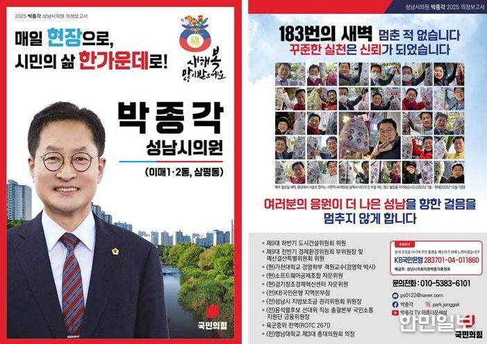 한민일보 서울포커스 김성혜 기자 | 성남시의회 박종각 의원(국민의힘, 이매1·2동·삼평동)이 2025년 의정활동 성과를 정리한 의정보고서를 발간했다. 제9대 시의회 임기 동안 현장을 누빈 활동과 지역 민생 개선의 결과들을 담아낸 내용이다.