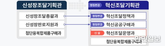 먼저, 기존의 신성장조달기획관을 「혁신조달기획관」으로 개편한다. 이는 막대한 공공구매력을 정책 수단으로 전략적 활용하여 혁신기업의 성장을 지원하는 ‘혁신조달’의 기능을 보다 명확히 하기 위해서다. 기존 소속 부서들의 명칭 또한 담당 업무를 좀 더 직관적으로 이해할 수 있도록 변경한다.