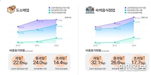 핵심 수치로는 2020년 기준 도소매업의 평균 영업이익은 2,520만원으로 근로자 평균임금 미만 사업체 77.6%, 최저생계비 미만 61.4%, 손실 발생 18.1%로 나타났으며, 숙박음식점업의 평균 영업이익은 1,000만원으로 근로자 평균임금 미만 사업체 85.7%, 최저생계비 미만 73.2%, 손실 발생 19.7%로 나타나 도소매업보다 더 취약한 양상을 보였다.